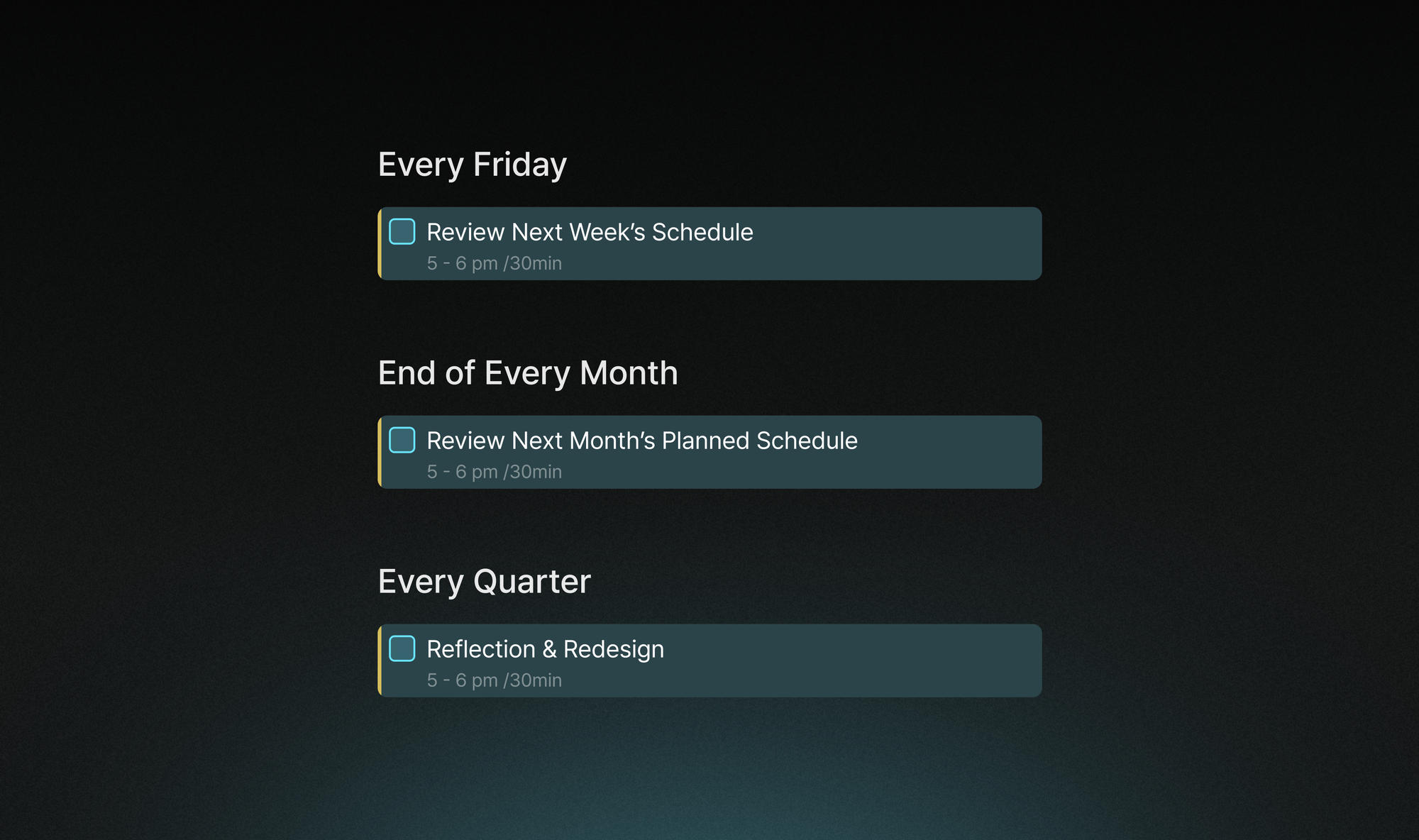 This is the heart of calendar first time design. It is not about making a perfect plan once. It is about continuously checking and adjusting your intent.