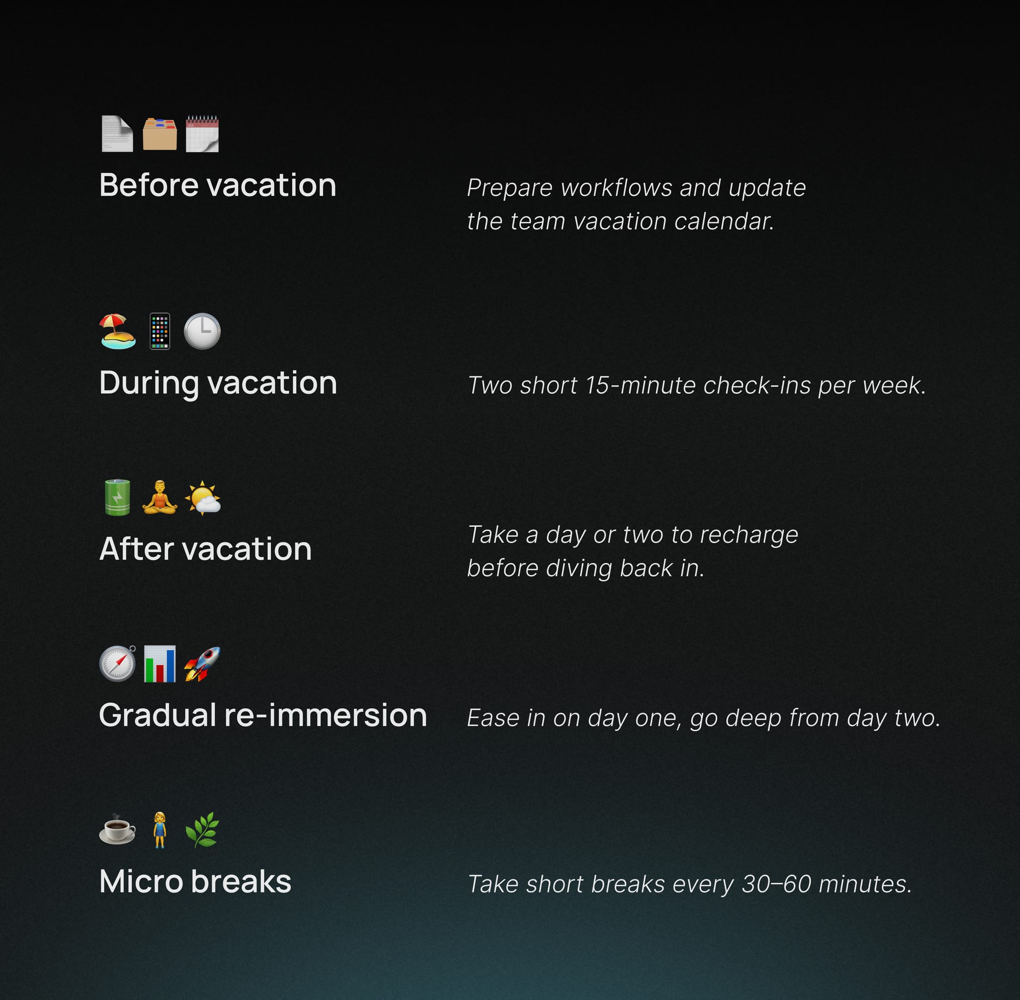 또한 휴가 전 마지막 날에는 가능한 업무를 일찍 마무리하고, 남은 시간은 '멘탈 전환'에 활용하세요. 이는 업무 모드에서 휴식 모드로 자연스럽게 전환하는 데 도움이 됩니다.