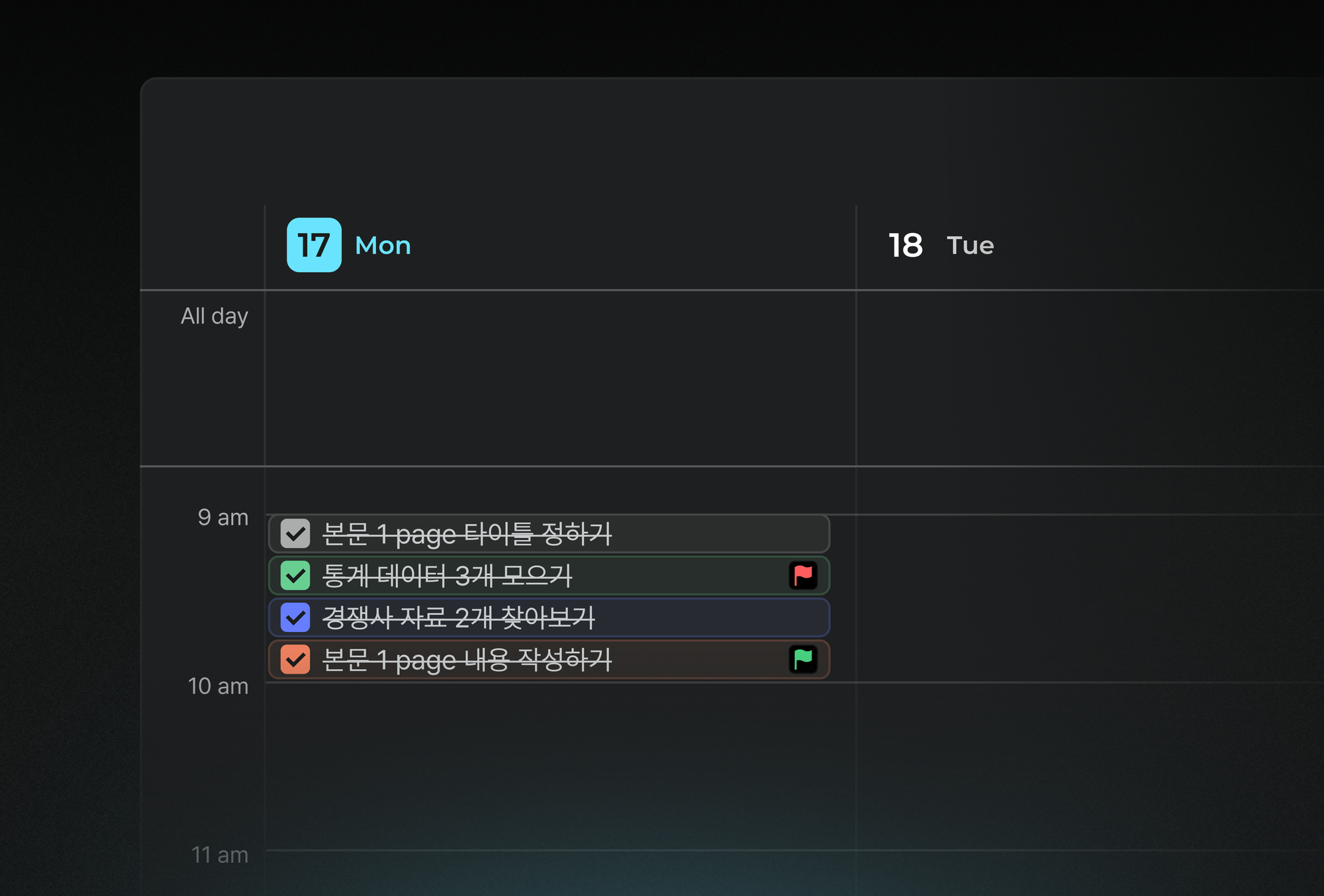 • 작은 태스크라도 완료할 때마다 완료 표시(✓)를 해두면, 그 자체로 “해냈구나!” 하는 뿌듯함을 느낄 수 있습니다.