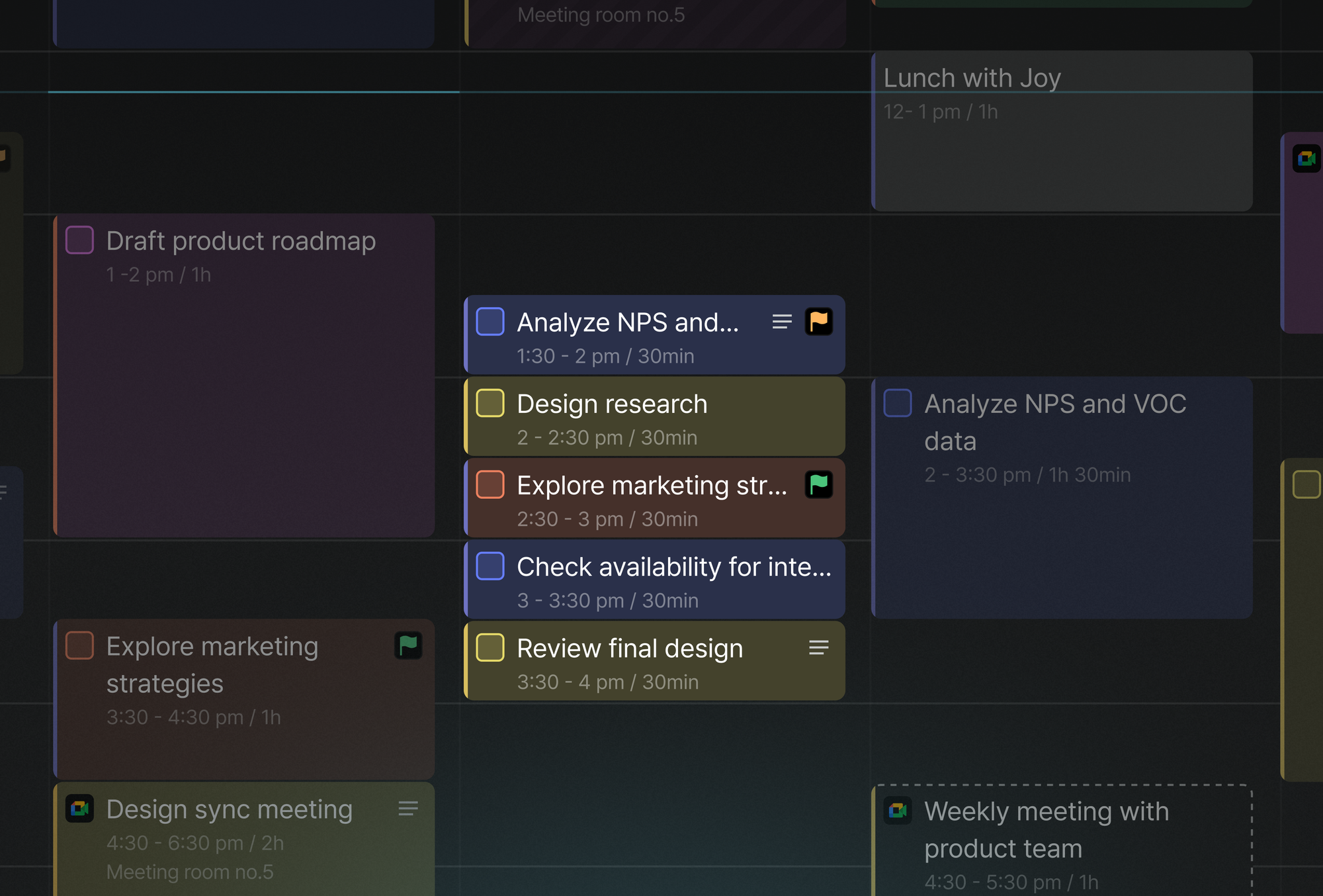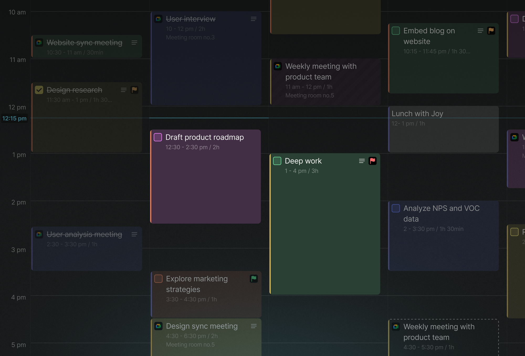 - More realistic plans: seeing your day as blocks helps you right size the workload. Leaving buffer time between blocks keeps you steady when surprises arise.